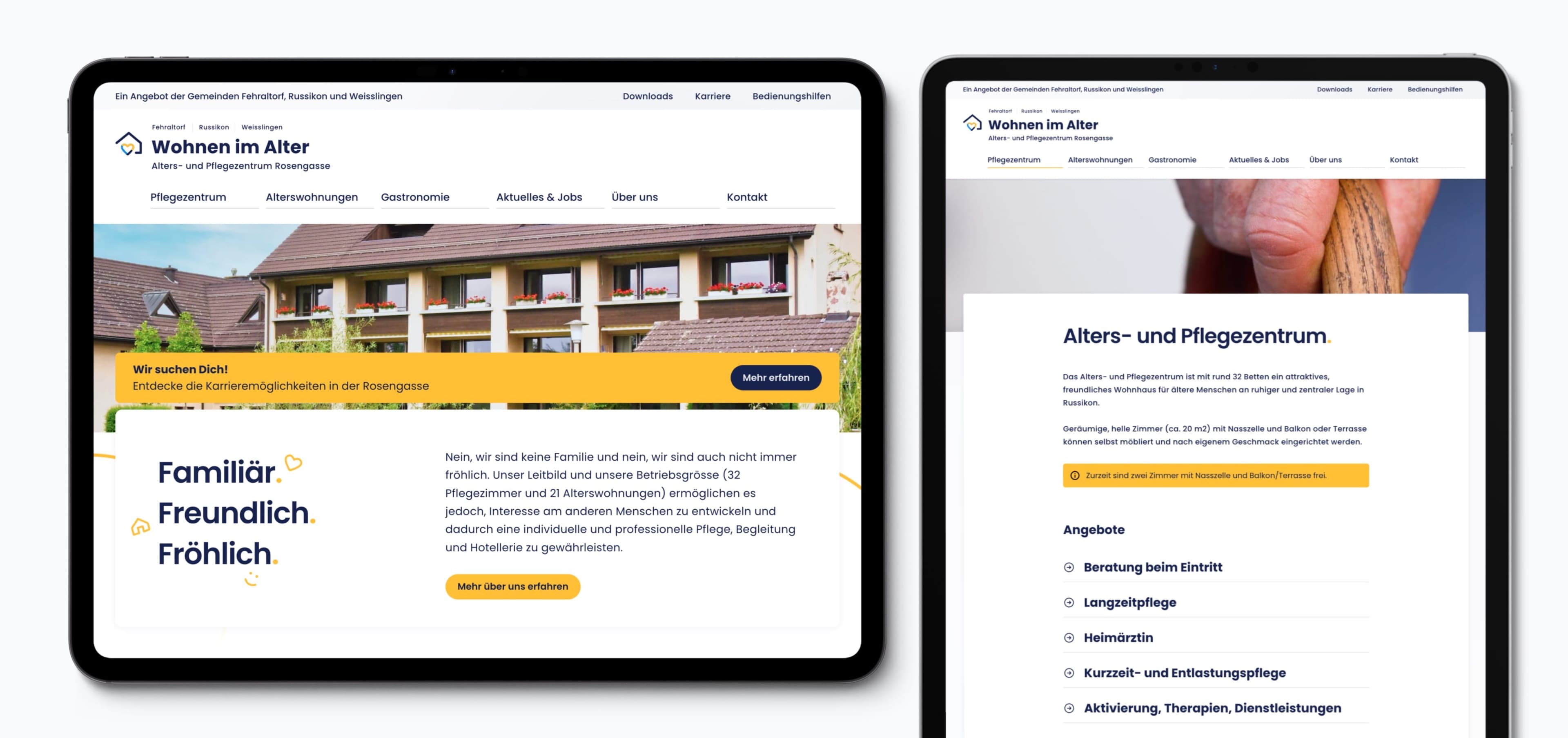 Für das Alters- und Pflegezentrum Rosengasse der Gemeinden Fehraltdorf, Russikon und Weisslingen haben wir einen frischen visuellen Auftritt mit neuer Webseite erarbeitet.